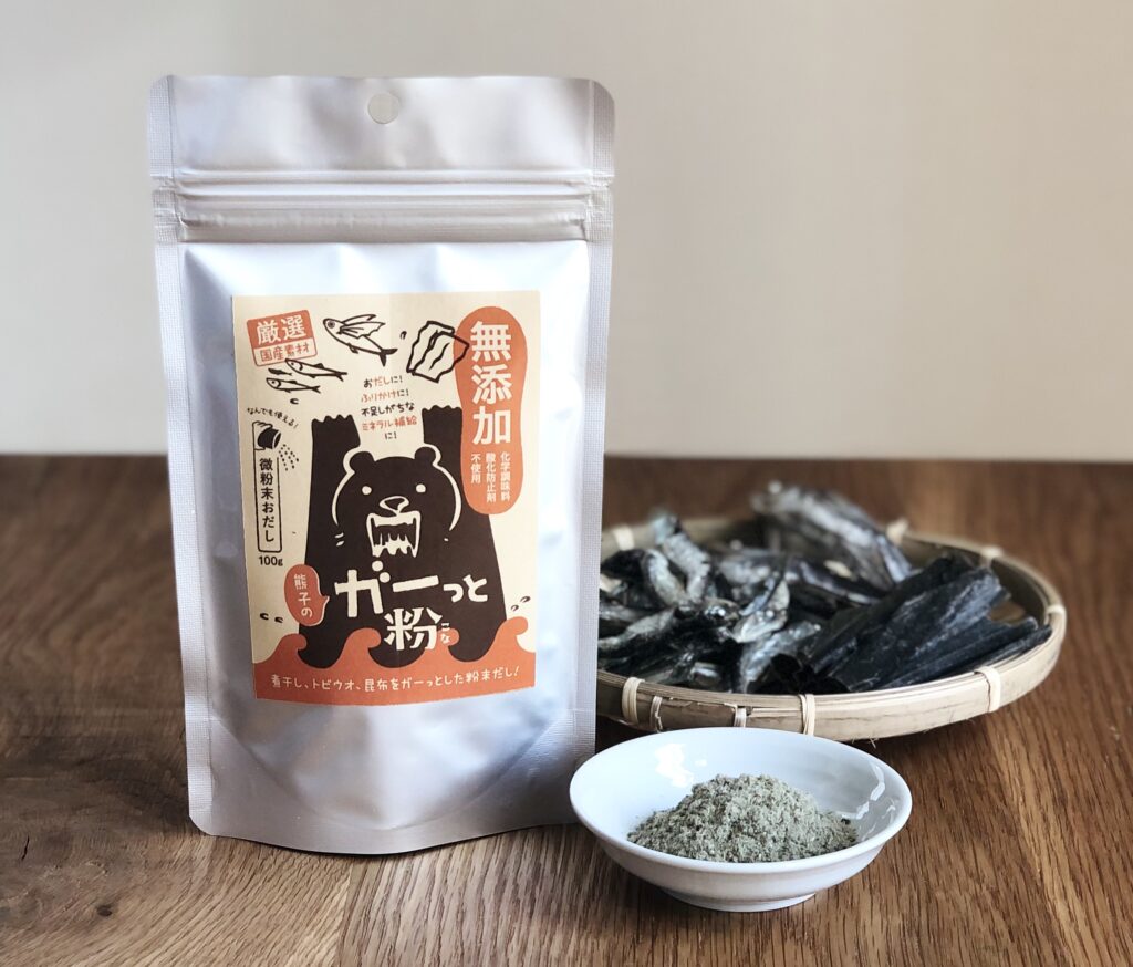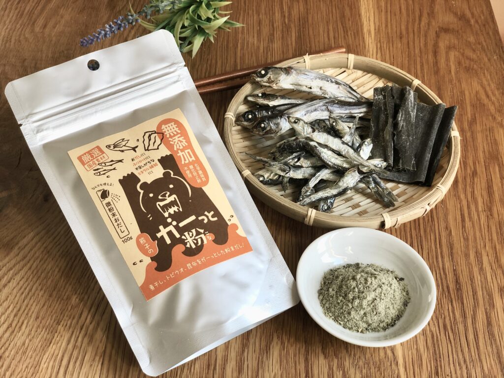 主力商品である、ガーっと粉®は、山陰沖産のいりこと飛び魚煮干し、道南産真昆布のみを使用した微粉末のだし粉です。